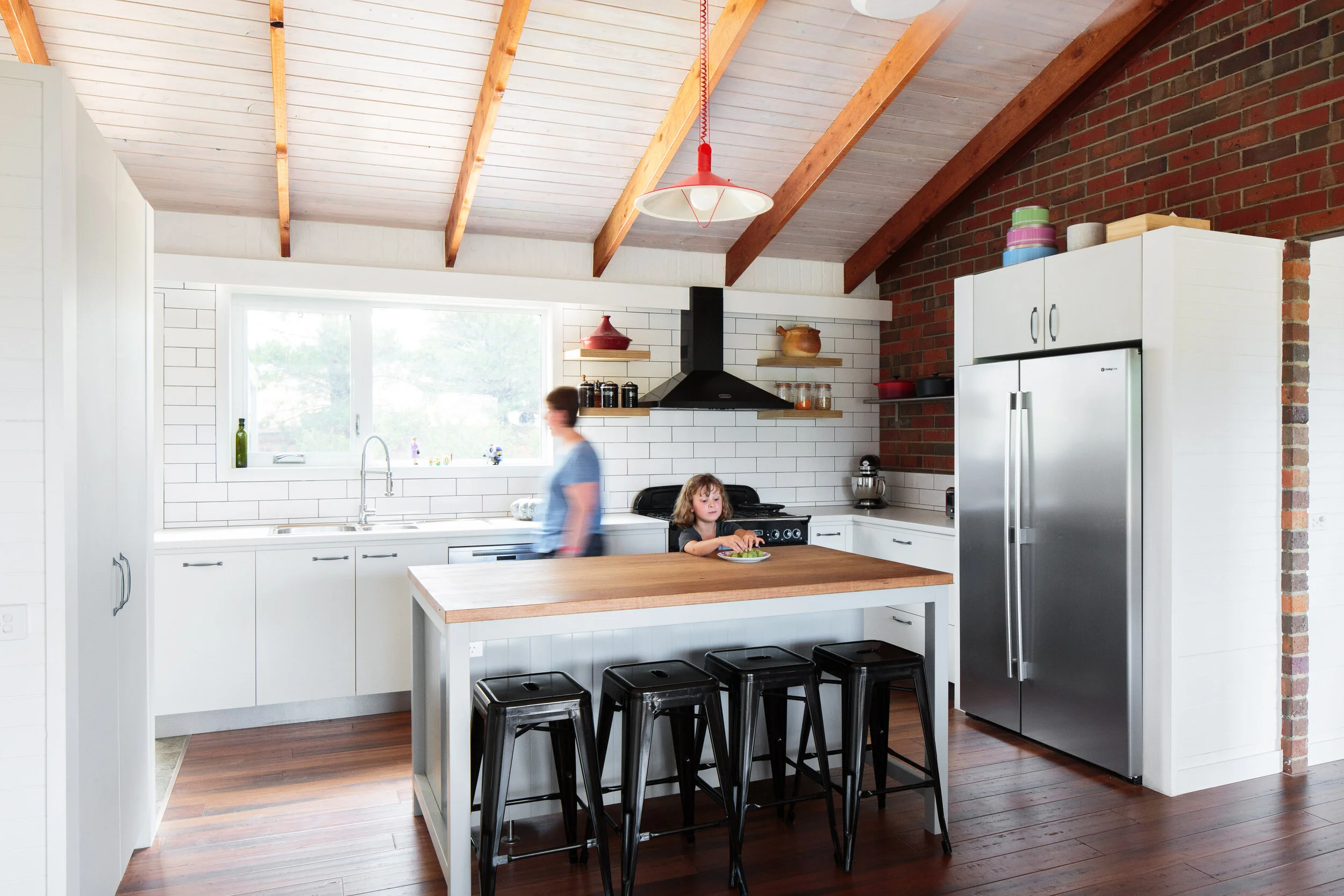 This project shows that even a cold, dark 1980s farmhouse can become a light, bright, energy-efficient family home. The original home was cold and draughty with a solid-roofed verandah that wrapped around the building and blocked any sunshine from entering the home. The ‘90s material scheme of exposed brick and timber cladding added to the dark and oppressive feel of the home.