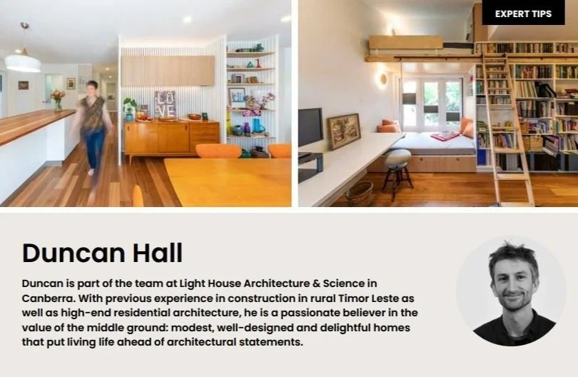 Our terrific team member Duncan Hall added his tips to a fabulous feature article — When Less is more: the case for smaller homes — referencing his favourite project, the multi-award winning Little Loft House.
